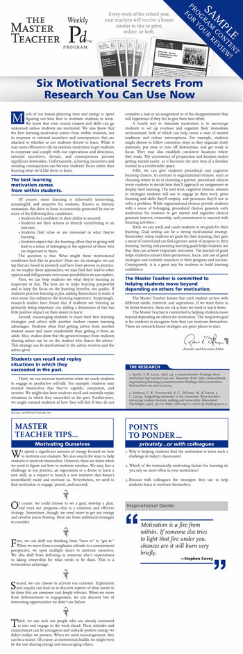 The Master Teacher Weekly Pd Program provides teachers with a weekly dose of help and inspiration through concise lessons available in print, online, or both. Print customers receive monthly lesson shipments, while online customers get weekly emails with a link to the lesson.